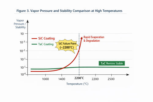 Cobhsaíocht Theirmidinimiciúil Gan Chomhoiriúnú: Tá leáphointe tuartha de 3880°C ag Tantalum Carbide (TaC). De réir taighde in Journal of Crystal Growth, téann bratuithe SiC faoi "ghalú míchuí" os cionn 2200 ° C - áit a bhfolaíonn sileacain níos tapúla ná carbóin, rud a fhágann díghrádú struchtúrach agus éilliú cáithníní. I gcodarsnacht leis sin, is é 3 go 4 brú gaile TaCorduithe méid níos ísle ná SiC, a chothabháil réimse teirmeach pristine le haghaidh fás criostail.