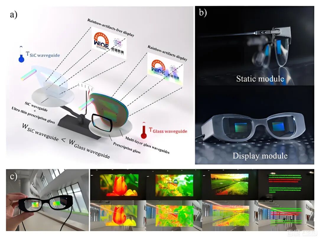 Tá innéacs athraonta de thart ar 2.6 ag chomhdhúile sileacain aonchriostail (SiC) sa speictream solais infheicthe, le trédhearcacht den scoth, rud a fhágann go bhfuil sé oiriúnach do dhearaí tonntreoraithe optúla ard-chomhtháite. Bunaithe ar a n-airíonna ard-innéacs athraonta, is féidir le tonnthreoir díraonta SiC aon-chiseal réimse radhairc (FOV) de thart ar 70 ° a bhaint amach go teoiriciúil agus patrúin tuar ceatha a shochtadh go héifeachtach. Ina theannta sin, tá seoltacht teirmeach an-ard ag SiC (thart ar 4.9 W/cm·K), rud a ligeann dó teas a scaipeadh go tapa ó fhoinsí optúla agus meicniúla, rud a chuireann cosc ar dhíghrádú feidhmíochta optúla de bharr ardú teochta. Ina theannta sin, cuireann cruas ard agus friotaíocht caitheamh SiC go mór le cobhsaíocht struchtúrach agus marthanacht fhadtéarmach na lionsaí tonntreoraithe. Is féidir sliseog SiC a úsáid le haghaidh próiseála micrea/nana (amhail eitseáil agus bratú), chun comhtháthú struchtúr micrea-optúil a éascú.